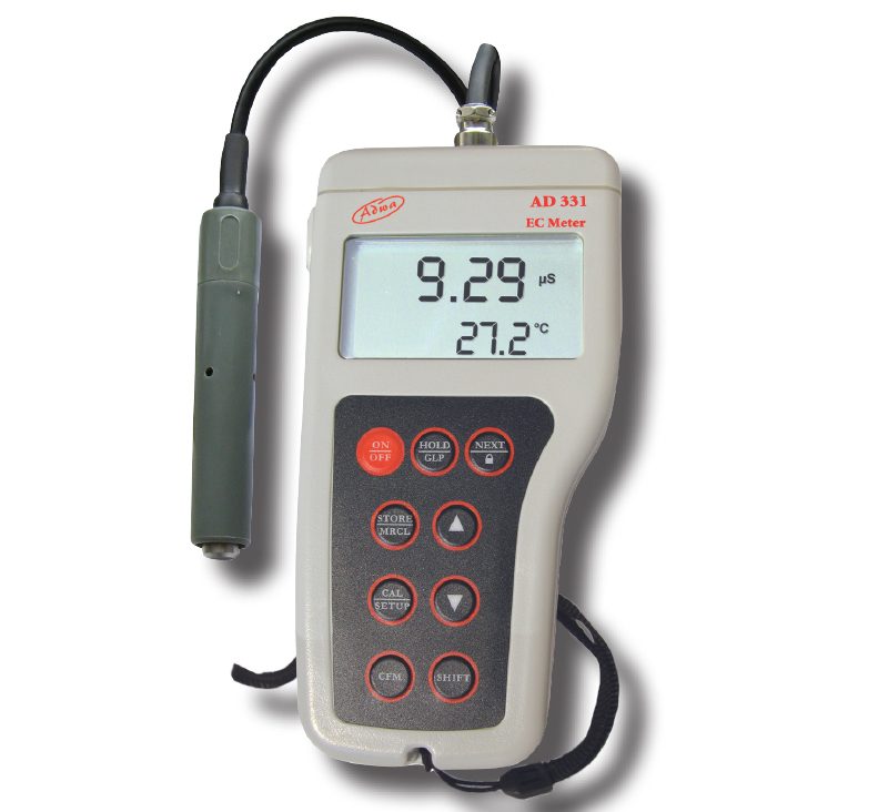 AD331 is a waterproof portable meter that reads Conductivity in 5 ranges and temperature.